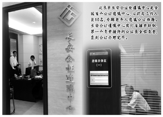 據(jù)了解,今年4月初成立的北京市長安公證遺囑中心是全國首個公證遺囑中心,目前中心有工作人員10名,專門解決老年人遺囑公證的難題。
